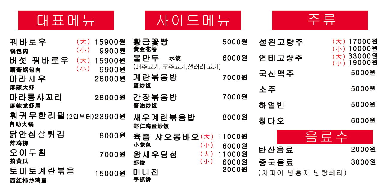 마라탕 /麻辣烫 小 500g 9,000 | 마라샹궈/麻辣香锅 500g 15,000 | 꿔바로우( 중 ) 10,000 | 꿔바로우 ( 대 ) 15,000 | 계란볶음밥 6,000