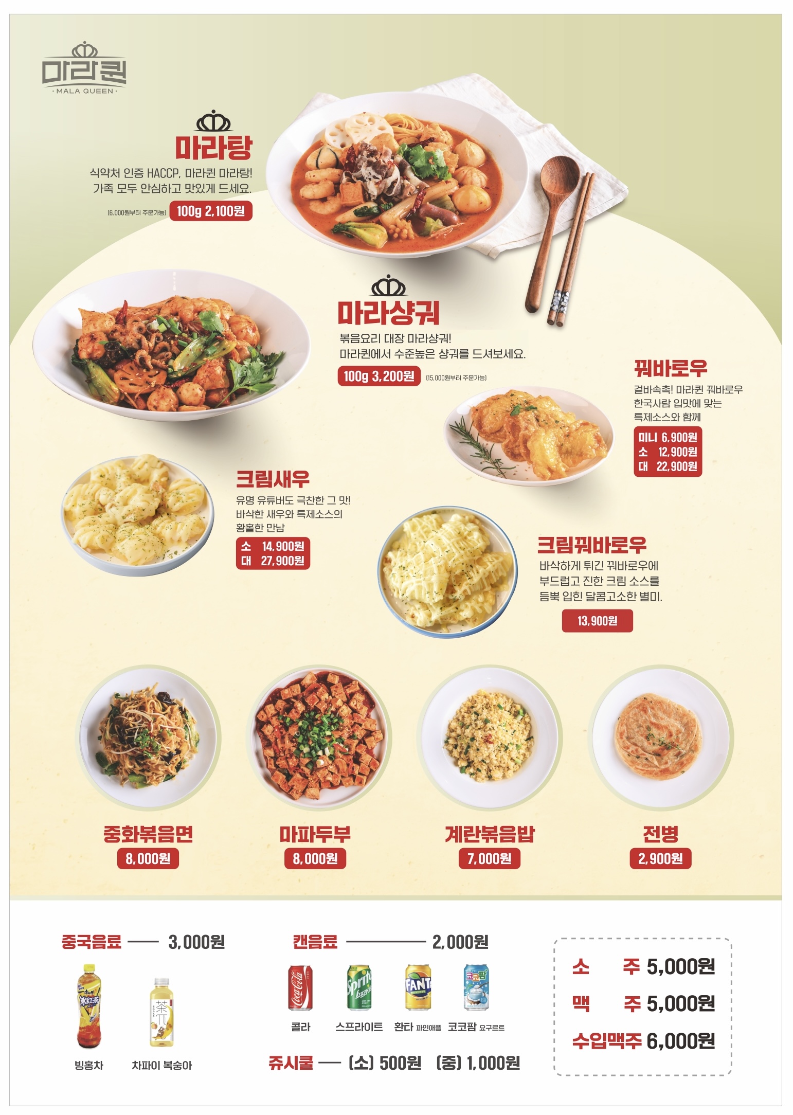 꿔바로우 6,900 | 크림새우 14,900 | 마라샹궈(100g당) 3,200 | 마라탕 (100g당) 2,100 | 마파두부 8,000 | 중화볶음면 8,000 | 게란볶음밥 7,000 | 전병 2,900