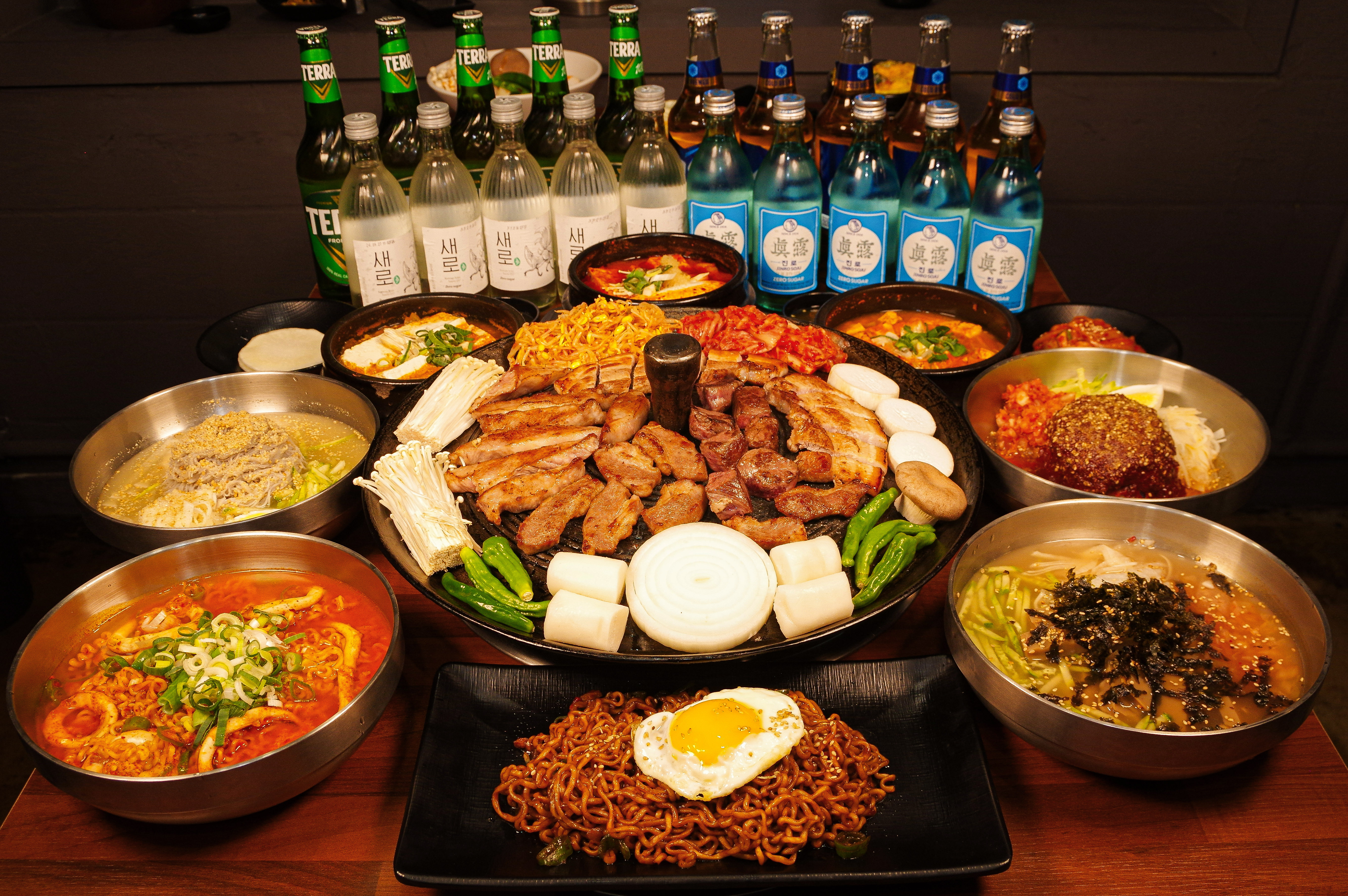 연탄 초벌 삼겹살 13,000 | 연탄 고추장 불고기 13,000 | 연탄 파 불고기 13,000 | 김치말이국수 5,000 | 비빔냉면 7,000