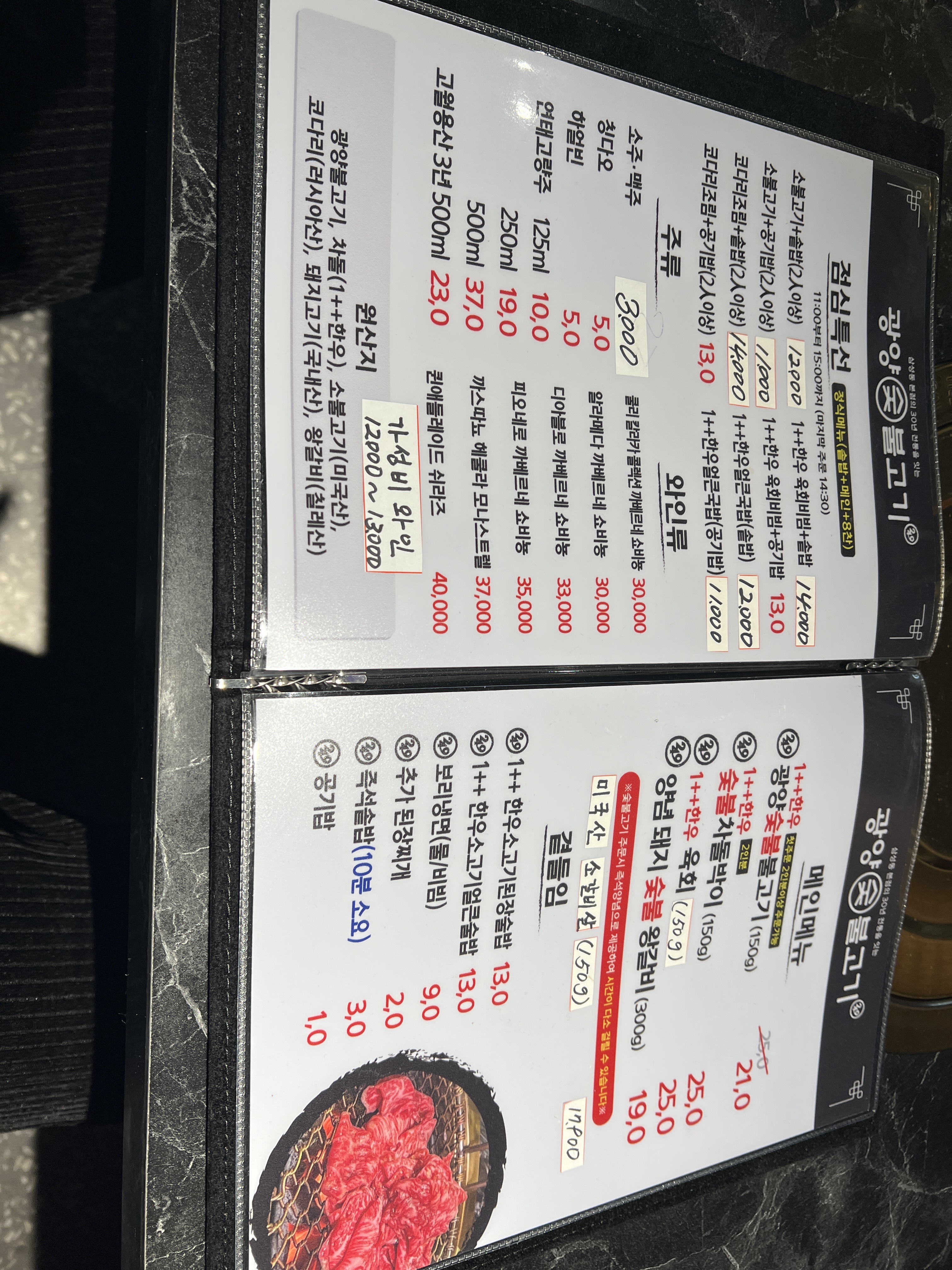 소갈기살150g (양념) 18,900 | 소갈비살(생)150g 17,900 | 소주 3,000 | 맥주 3,000 | 레드와인750ml 12,000~13,000 | 1++한우광양불고기(150g) 21,000 | 1++한우육회(150g) 25,000 | 1++한우차돌(150g) 25,000 | 양념돼지숯불왕갈비(300g) 19,000 | (점심특선)소불고기+솥밥(2인이상) 12,000 | (점심특선)소불고기+공기밥(2인이상) 11,000 | (점심특선)코다리조림+솥밥(2인이상) 13,000 | (점심특선)코다리조림+공기밥 2인이상 12,000 | (점심특선)1++한우 육회비빔+솥밥 14,000 | (점심특선)1++한우 육회비빔밥 13,000 | 점심특선)1++한우얼큰국+솥밥 12,000 | (점심특선)1++한우얼큰국밥(공기밥) 11,000 | 1++한우 얼큰소고기 (술밥) 13,000 | 1++한우소고기된장(술밥) 13,000 | 보리물냉면 9,000 | 보리비빔냉면 9,000