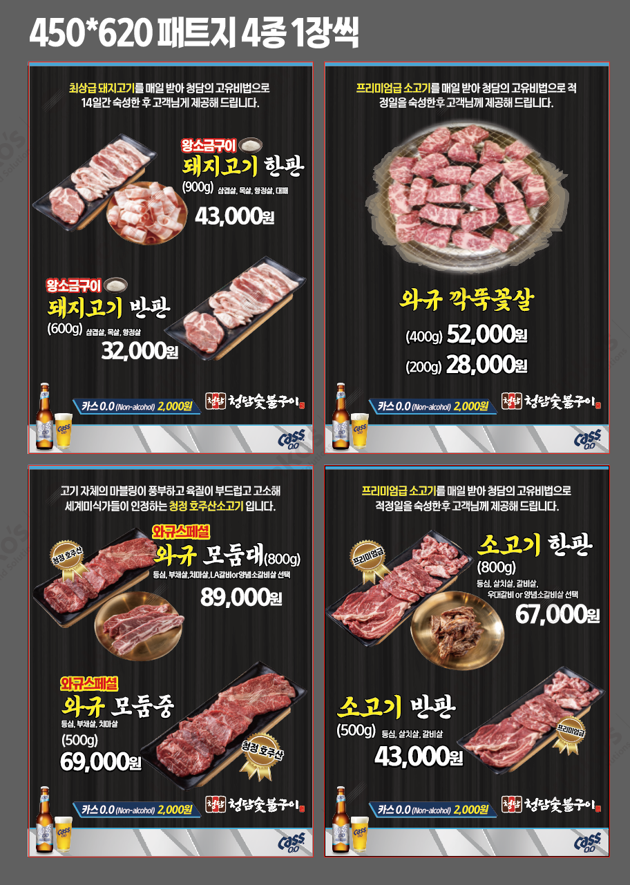 와규깍뚝꽃살(400g) 52,000 | 와규모둠대(등심부채살치마살LA갈비) 89,000 | 와규모둠중(등심 부채살 치마살) 69,000 | 소고기한판(등심갈비살살치살우대갈비) 67,000 | 소고기반판(등심 갈비살 살치살) 43,000 | 돼지한판(삼겹 항정 목살 대패삼겹살) 43,000 | 돼지반판(삼겹살 항정살 목살) 32,000