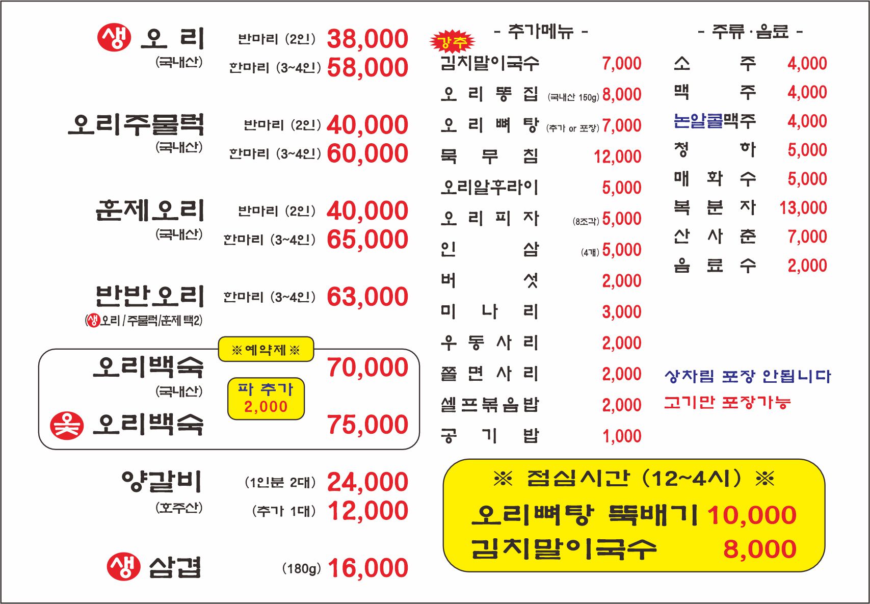 생오리로스 한마리(3~4인) 58,000 | 생오리로스 반마리(2인분) 38,000 | 오리주물럭 한마리(3~4인) 60,000 | 오라주물럭 반마리(2인) 40,000 | 훈제오리 한마리(3~4인) 65,000 | 훈제오리 반마리(2인) 40,000 | 반반오리 (생오리/주물럭/훈제 2택) 63,000 | 양갈비 1인분 (2대) 24,000 | 국내산생삼겹 1인분 (180g) 16,000 | (최소2시간전 예약제) 옻 오리백숙 75,000 | (최소2시간전 예약제 ) 오리백숙 70,000 | (사이드) 묵무침 12,000 | (점심메뉴) 오리뼈탕뚝배기 10,000 | (점심메뉴) 김치말이국수 8,000 | (사이드) 오리똥집 150g 8,000 | (사이드)오리뼈탕(포장) 7,000 | (사이드) 김치말이국수(후식) 7,000 | 소주 4,000 | 맥주 4,000
