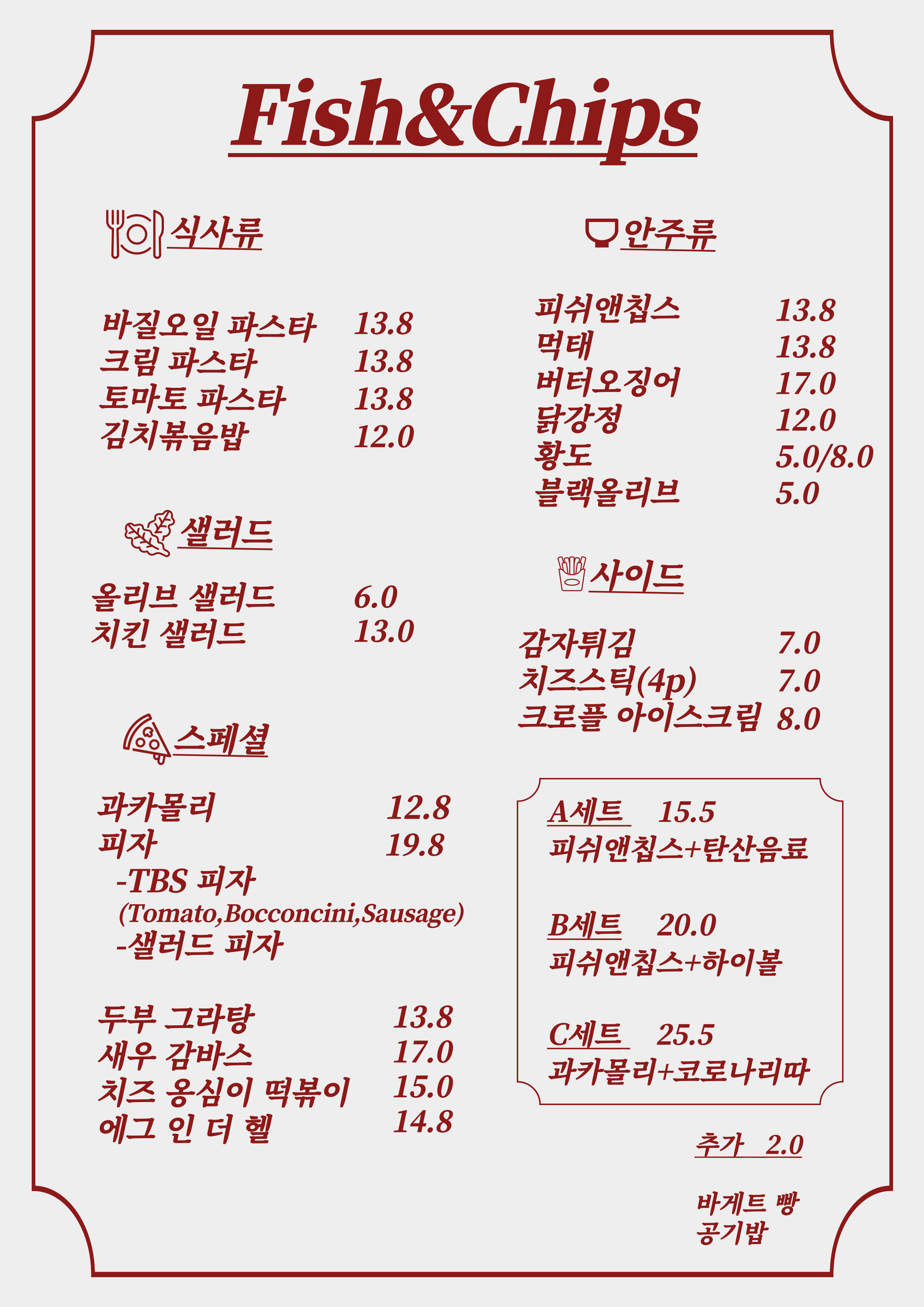 과카몰리 12,800 | 피자(TBS/Salad) 19,800 | 피쉬앤칩스 13,800 | 바질오일파스타 13,800 | 크림파스타 13,800 | 토마토파스타 13,800 | 올리브 샐러드 6,000 | 치킨샐러드 13,000 | 새우감바스 17,000 | 치즈옹심이떡볶이 15,000 | 감자튀김 7,000 | 치즈스틱(4p) 7,000