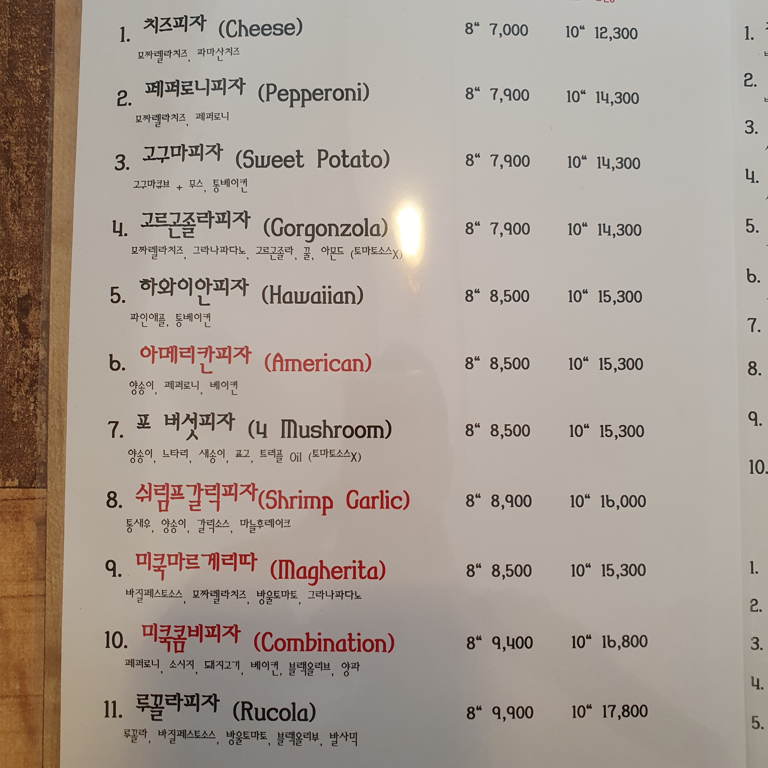 마르게리따 20,000 | 고르곤졸라 20,000 | 루꼴라 22,000 | 까르보나라 15,000 | 빠네크림파스타 17,000 | 토마토파스타 12,000 | 쉬림프아라비아따 13,500 | 봉골레 15,000 | 김치볶음밥 8,500 | 함박(기본/매운토마토) 16,000