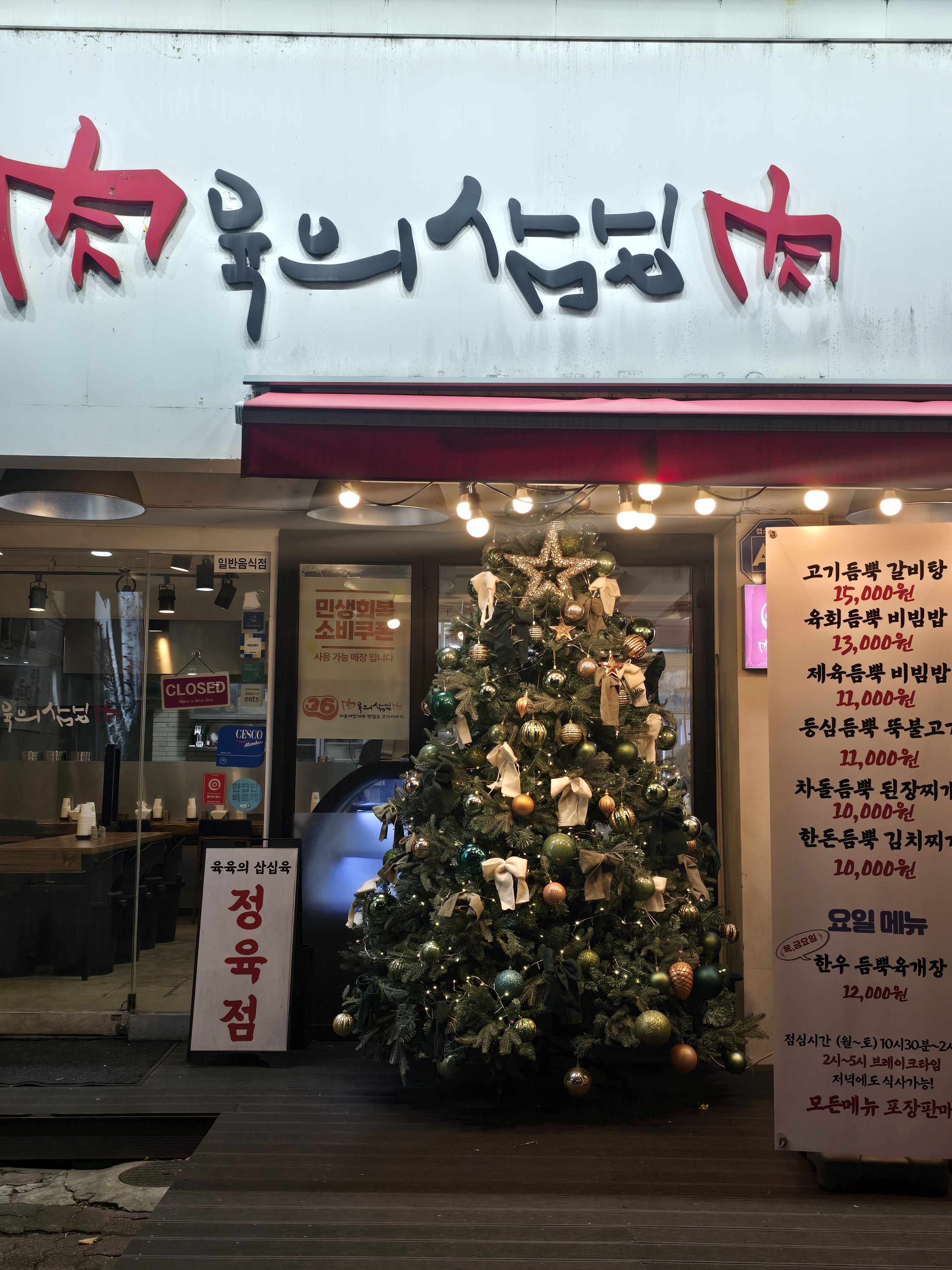 돼지갈비(250g) 18,000 | 소생갈비살(150g) 23,000 | 소양념갈비살(150g) 23,000 | 녹돈 생삼겹살(200g) 18,000 | 육수불고기(300g) 19,000 | 한우(++)육회 30,000 | 왕 갈비탕 12,000 | 차돌된장 10,000 | 뚝배기 불고기 10,000 | 우렁 순두부 9,000 | 양푼김치찌개 9,000 | 물냉면(칡) 9,000 | 비빔냉면(함흥) 9,000 | 물냉면 후식 6,000 | 비빔냉면 후식 6,000 | 순두부찌개(후식) 5,000 | 후식 된장찌개 2,000