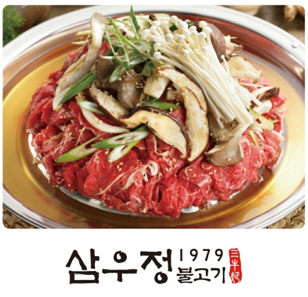 삼우정 등심 불고기 26,000 | 버섯불고기전골 28,000 | 갈비낙지전골 35,000 | 낙지불고기전골 31,000 | 갈비찜 36,000 | 양념왕갈비 52,000 | 물냉면 15,000 | 비빔냉면 15,000 | 황태구이 정식 21,000 | 영양갈비탕 18,000 | 육개장 15,000 | 차돌된장찌개 15,000 | 복분자 20,000 | 맥주 (클라우드) 7,000 | 맥주 (카스) 7,000 | 소주 6,000 | 콜라/ 사이다 3,000