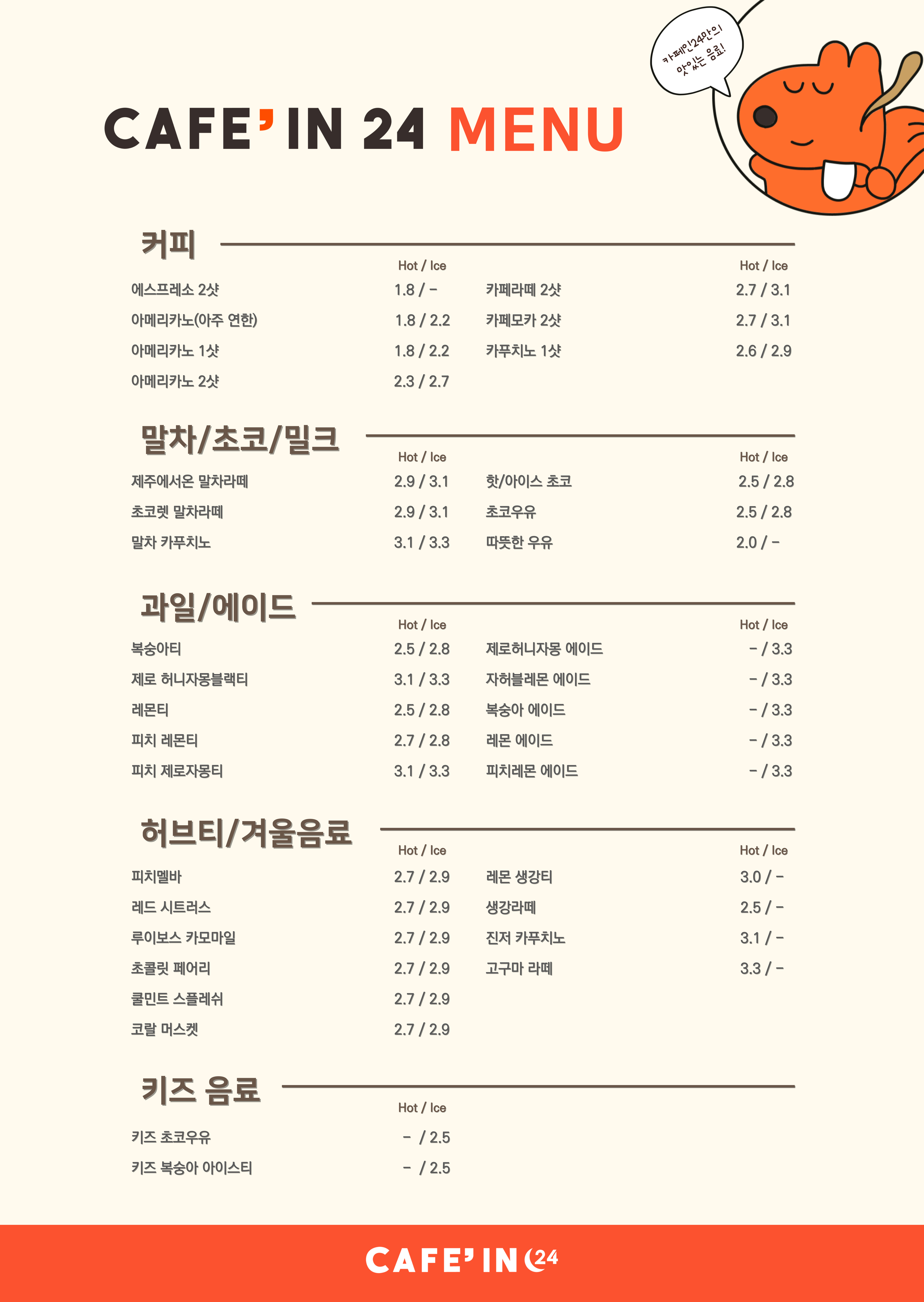 하루언제나 원샷 아메리카노 1,800 | 정신번쩍투샷 아이스아메리카노 2,500 | 투샷 아이스카페라떼 2,900 | 부드러운 아이스카푸치노 2,900 | 아이스 미숫가루 3,100 | 달콤한 아이스복숭아 2,800 | 피치자몽 아이스티 3,000 | 아샷추 (복숭아&커피) 2,900 | 자샷추 (자몽&커피) 2,900 | 열공후엔 아이스초코라떼 2,800 | 고소든든 오곡라떼 2,900 | 찐초콜릿 오곡라떼 2,900 | 아이스 초코퐁당 미숫가루 3,100 | 아이스 피치퐁당 미숫가루 3,100 | 루이보스카모마일 2,700 | 피치멜바 2,700 | 쿨민트스플레쉬 2,700 | 코랄머스캣 2,700 | 초콜릿페어리 2,700 | 레드시트러스 2,700