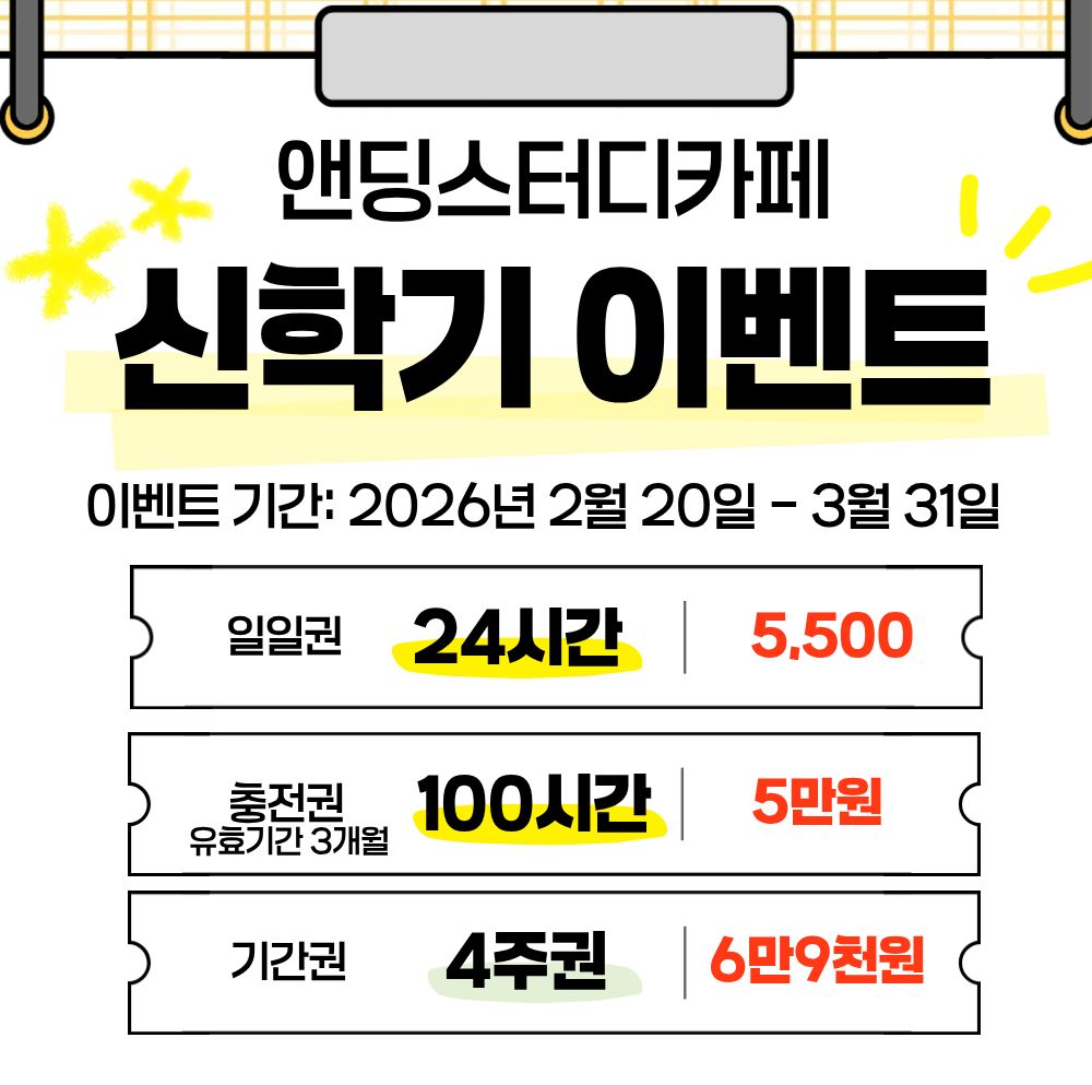 일일권 1시간 1,000 | 일일권 4시간 3,500 | 일일권 6시간 5,000 | 일일권 9시간 7,000 | 일일권 12시간 9,000 | 총전권 100시간 95,000 | 충전권 200시간 180,000 | 기간권 2주 65,000 | 기간권 4주 119,000 | 기간권 12주 320,000 | 사물함 2주 6,000 | 사물함 4주 10,000 | 스터디룸 2인실 1시간 3,000 | 스터디룸 4인실 1시간 6,000