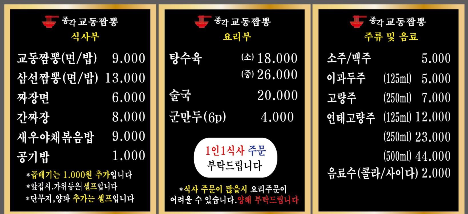삼선간짜장 11,000 | 고추삼선간짜장 12,000 | 백짬뽕 13,000 | 삼선짬뽕 13,000 | 고추삼선짬뽕 14,000 | 탕수육 26,000 | 전가복 95,000