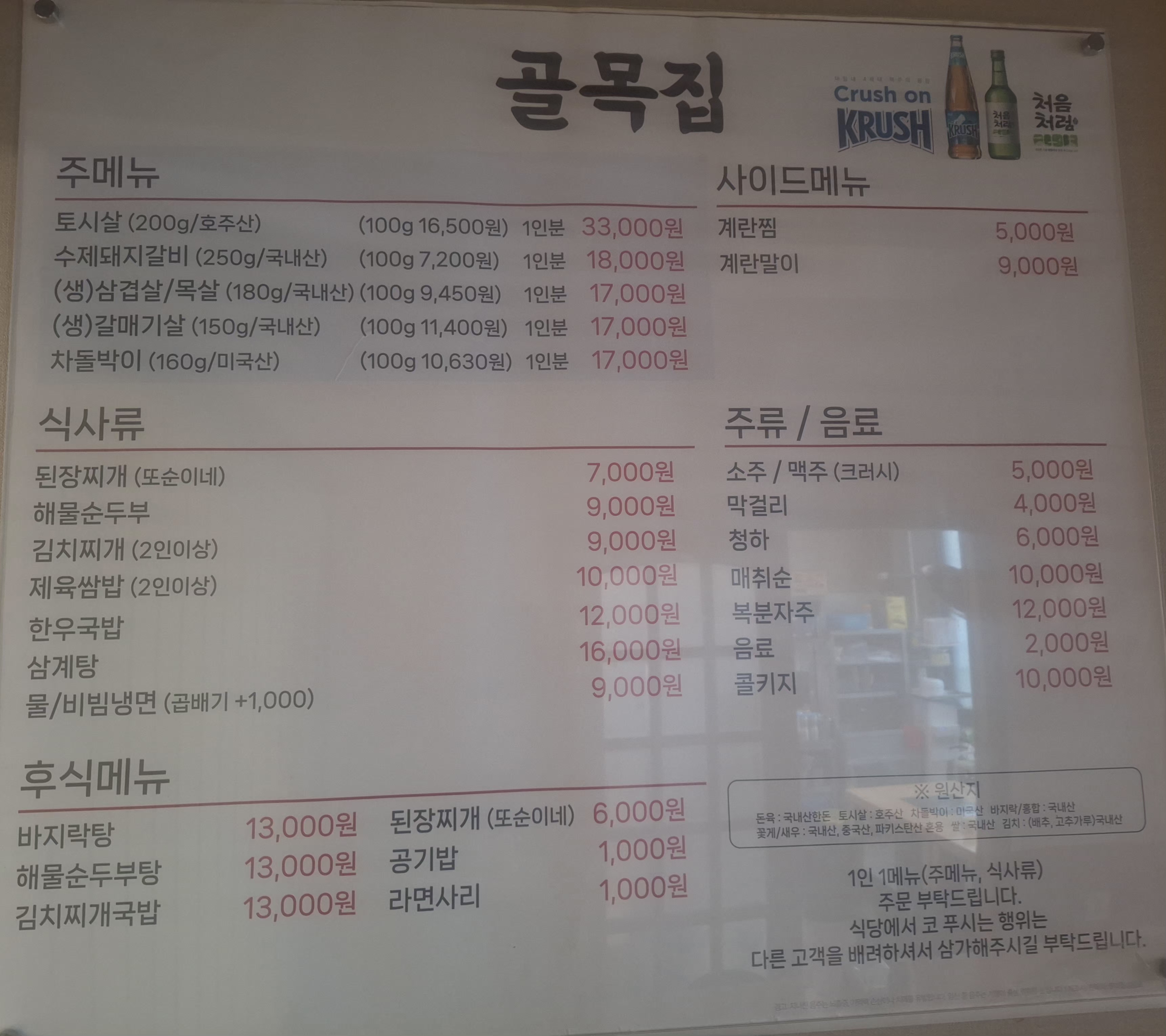 토시살 33,000 | 돼지갈비250g 18,000 | 생삼겹살180g 17,000 | 생목살180g 17,000 | 차돌박이160g 17,000 | 생갈매기살150g 17,000 | 된장찌개 7,000 | 해물순두부 9,000 | 김치찌개 (2인이상) 9,000 | 제육쌈밥(2인이상) 10,000 | 한우국밥 12,000 | 삼계탕 16,000 | 물/비빔냉면(곱+1000) 9,000 | 해물순두부탕(후식) 13,000 | 바지락탕(후식) 13,000 | 김치찌개국밥(후식) 13,000 | 후식된장 6,000 | 계란말이 9,000 | 계란찜 5,000 | 라면사리 1,000 | 공기밥 1,000 | 소주 5,000 | 맥주 5,000 | 막걸리 4,000 | 청하 6,000 | 매취순 10,000 | 복분자주 12,000 | 사이다,콜라 2,000